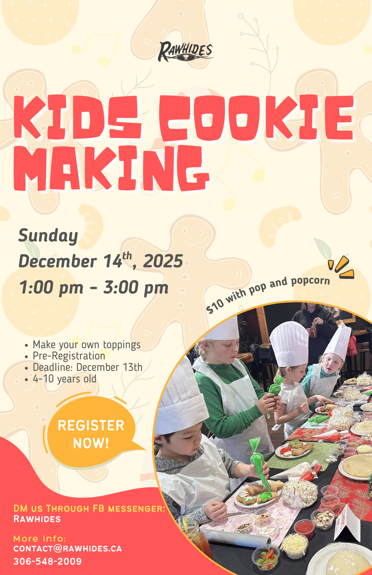 Let your little chefs shine this holiday season at Rawhides’ Kids Cookie Making event! Join us on Sunday, December 14th, 2025, from 1:00 PM to 3:00 PM for a fun and tasty afternoon where kids can decorate their own cookies, choose their favorite toppings, and enjoy pop and popcorn. It’s the perfect way to spark creativity and spread some sweet festive joy!
