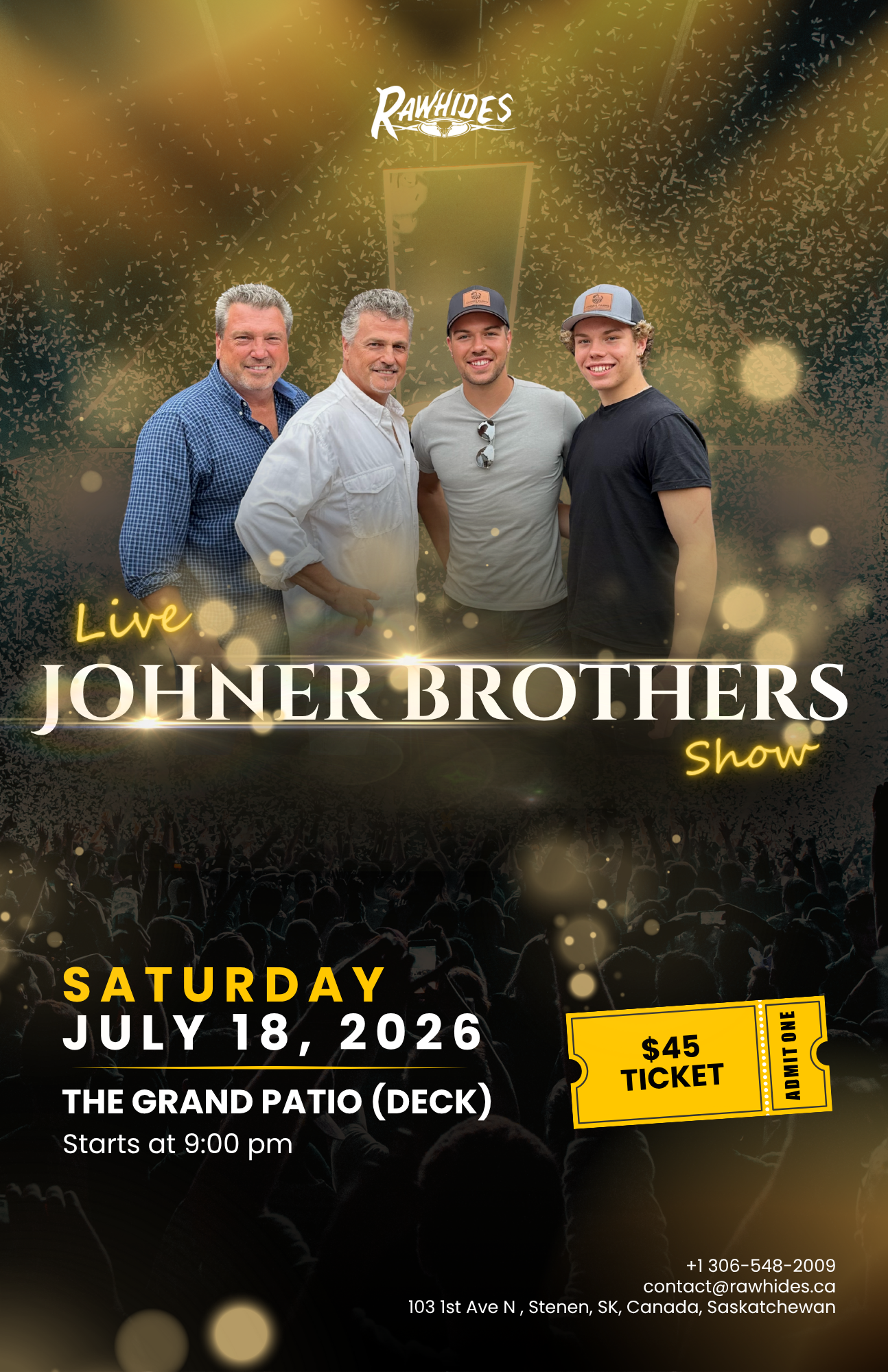 Join us as the legendary Johner Brothers take the stage for an evening filled with great country music, energy, and entertainment. Perfect for music lovers, friends, and a fun night out.